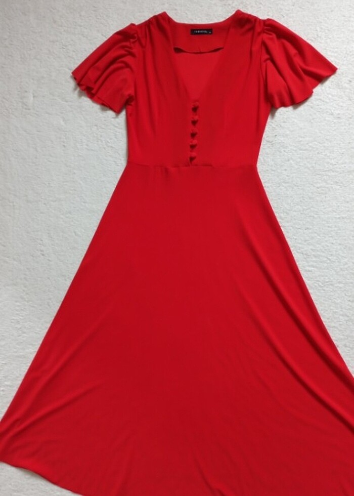 Xs beden. Birkaç kez giyildi. Ön tarafta fotoğrafta belli olmayan bir leke var, muhtemelen dolapta toz lekesi yıkanınca geçecektir. Arkada minik bir deforme var ancak giyilmeye engel ve büyük değil, görseli mevcut. Kloş ince kumaş, yazlık rahat bir şık elbise. Açık kırmızı renk.