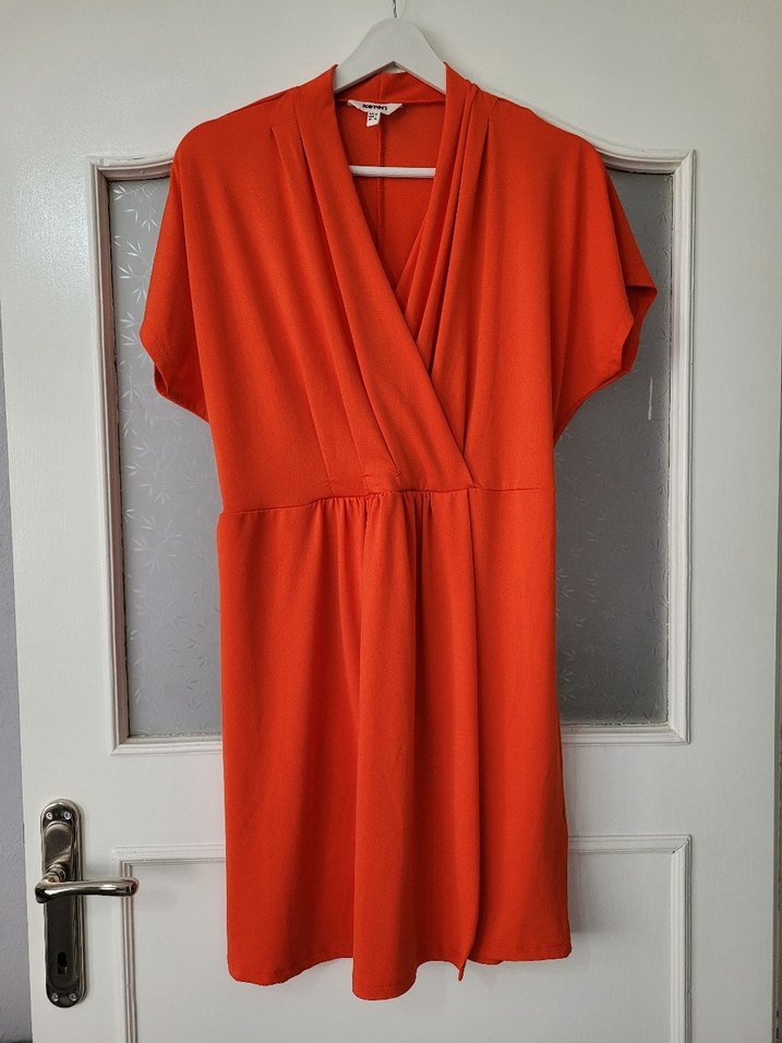 V yaka, kısa kollu, drapeli kırmızı elbise. Rahat kesimi ve midi boyu ile ofis kullanımı için uygundur.