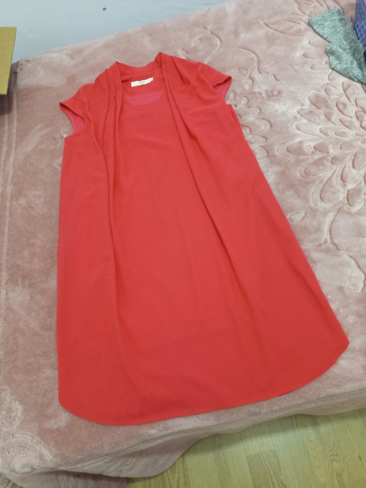 Kırmızı renkte, drapeli, kolsuz ve yuvarlak yakalı hamile elbisesi. Yumuşak sentetik kumaştan, rahat ve midi boyda, günlük kullanıma uygun.