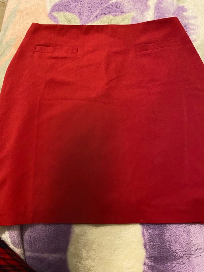 Kırmızı, düz desenli, ipeksi dokulu, belden oturan midi hamile eteği. Ofis için minimal ve şık bir tercih.
