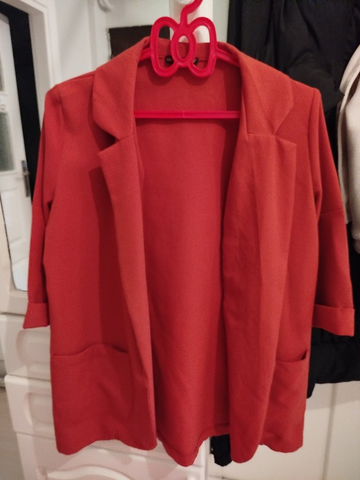 , kırmızı midi ceket, yakalı ve uzun kolludur. İki cepli, normal kesim, ofis için uygundur. Yumuşak ve sıcak kumaştan yapılmıştır. çokk hafif belirsiz tülerme var