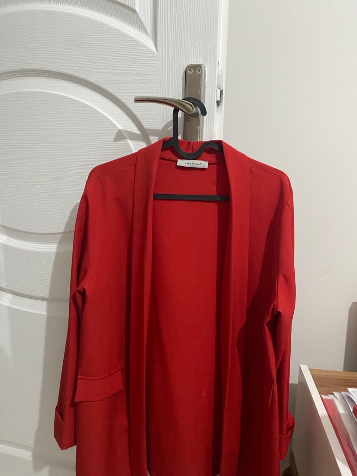 Kırmızı midi uzunlukta kadın ceketi, yakalı ve uzun kolludur. Parlak sentetik kumaştan yapılmış, dökümlü ve regular kesimlidir. Sokak modasına uygundur.
