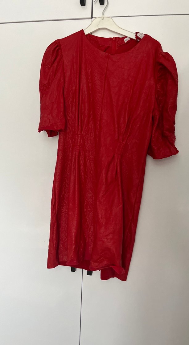 Parlak kırmızı renkte, bol kesim ve kısa kollu midi uzunlukta kadın elbisesi. Minimalist ve sokak modasına uygun tarzda. Derilerinde genleşmeden dolayı soyulmalar var kap batık kullanılabilir ya da tamamen derisi çıkartılıp kullanılabilir başka bir def