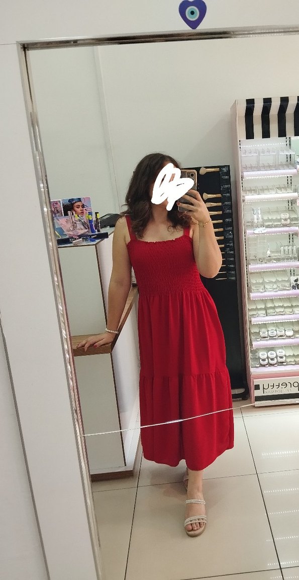 Koyu kırmızı pamuklu ve vücuda oturan bu midi elbise, minimal tarzda zahmetsiz şıklık sunar. Romantik akşamlar için ideal. S-M bedene uyumlu