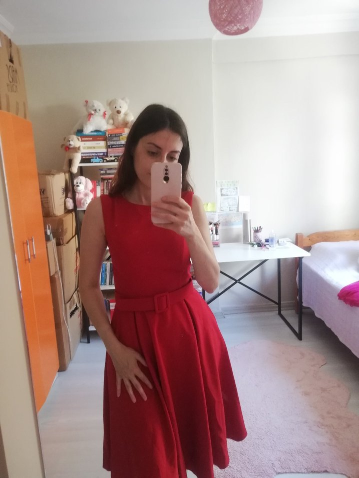 Parlak kırmızı, ipeksi kumaştan, kolsuz, vücuda oturan midi elbise. Retro pop kültür tarzıyla romantik akşamlar için şık ve rahat.