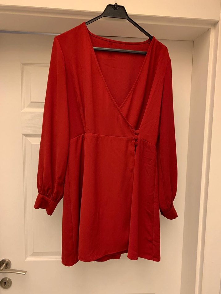 Koyu kırmızı midi elbise, uzun kollu ve bol kesimdir. Paris sokak modasını yansıtan desensiz sade tasarıma sahiptir.