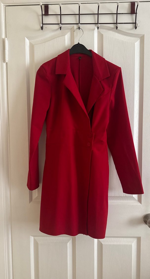 Kırmızı midi uzunlukta, düğmeli ve kesik yakalı kadın elbise. Uzun kollu, regular fit ve yumuşak, sıcak tutan kumaştan üretilmiştir.