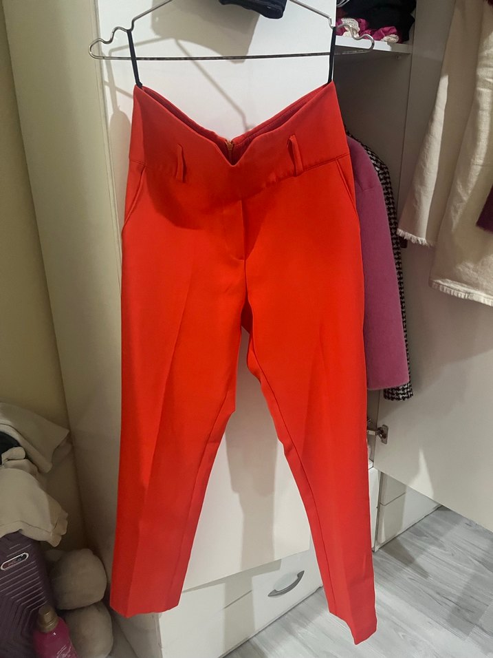 kırmızı midi uzunlukta kadın kumaş pantolon. Regular fit ve sentetik kumaş kullanılmış, desensiz ve iş ortamına uygun.