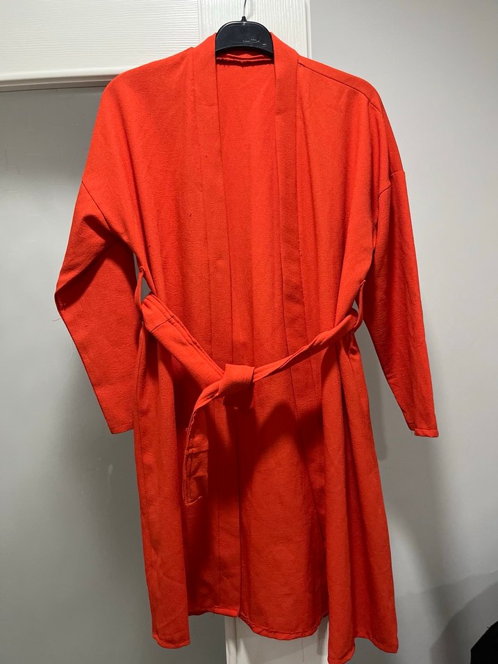 Canlı kırmızı renkte, midi boyda, uzun kollu ve bol kesim kadın kimono Minimalist tarzda, kuşaklı ve desensiz tasarım.