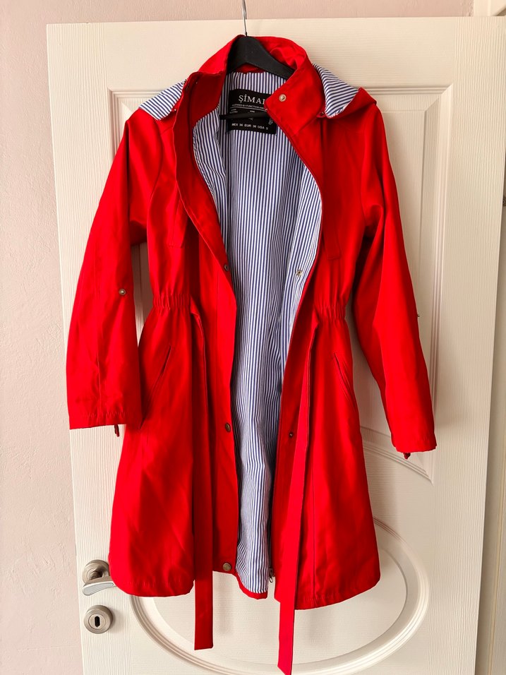 kırmızı renkte, düğmeli, yakası kesik ve uzun kollu kadın yağmurluğu. Çizgili astarı ve normal kesimiyle günlük şehir stiline uygun.