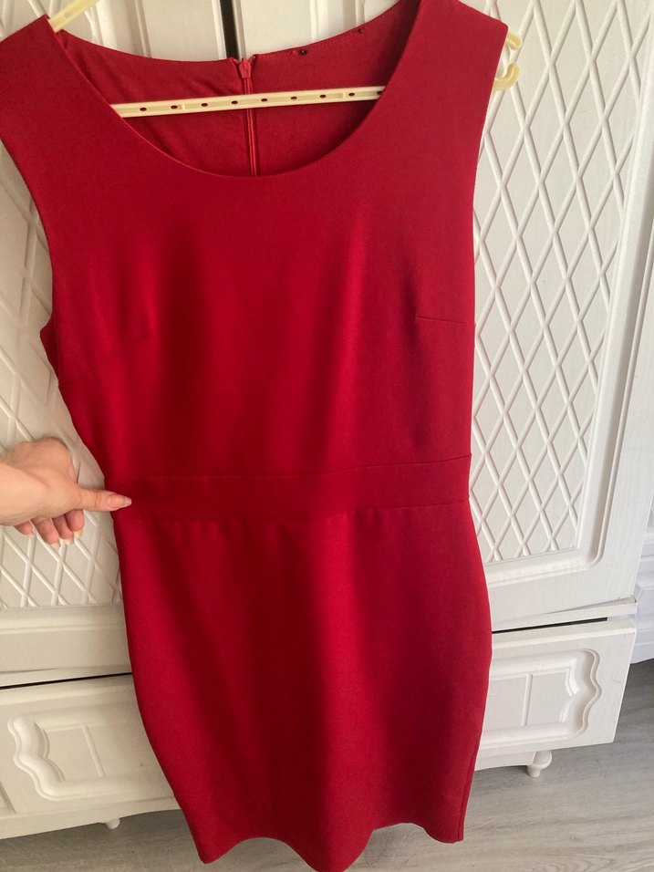Kırmızı parlak sentetik kumaştan, V yakalı, kolsuz, kalem kesim midi elbise. Arkada fermuarlı, modern klasik ofis stiline uygun.