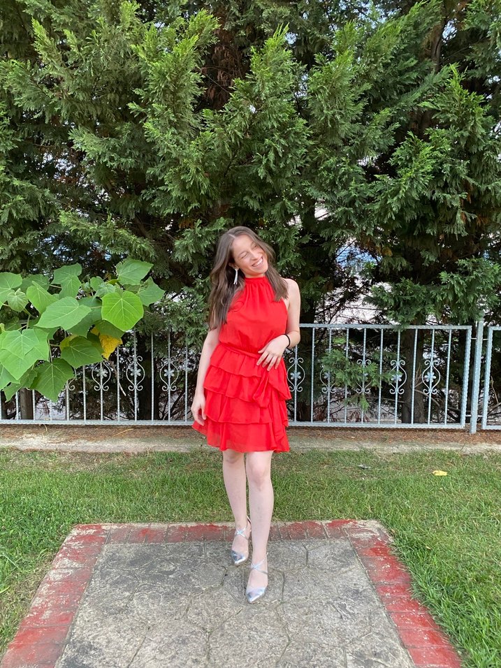 Bu kırmızı midi elbise, kat kat fırfır detayları ve parlak batik desenlidir. Askılı, straplez yakaya sahiptir ve partiler için uygundur.