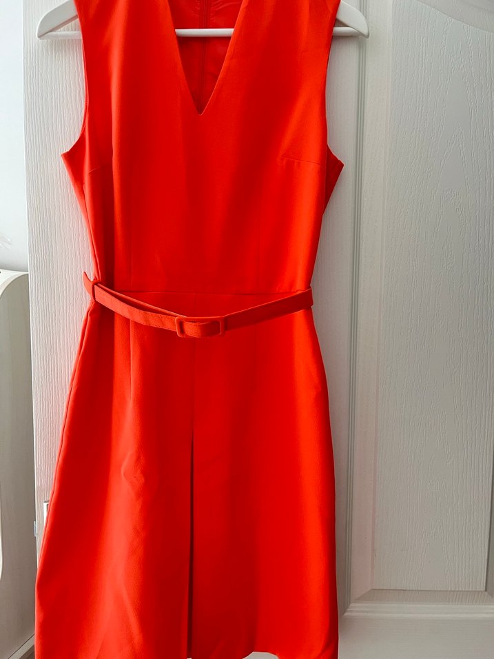 Kırmızı midi boy, kolsuz, V yakalı elbise. Belde kemer detayı ve minimalist tarzıyla ofis kullanımına uygundur. ✨Hiç kullanılmadı.