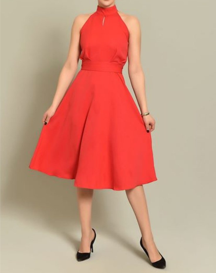 Kırmızı Midi Kolsuz Modern Klasik Elbise