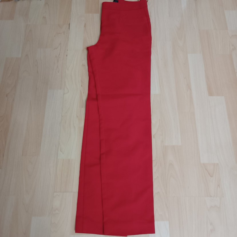 Kadınlar için kırmızı midi boy, regular fit kumaş pantolon. Parlak sentetik kumaştan, fermuarlı ve minimalist normcore tarzda, ofis kullanımı için uygun.