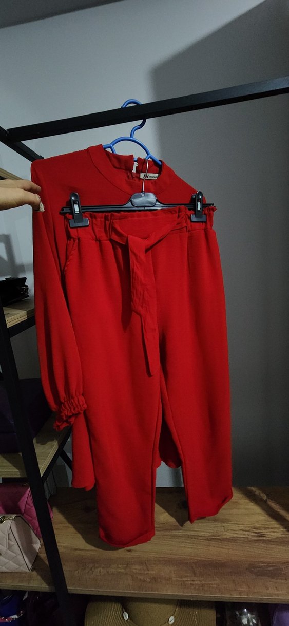 Parlak sentetik kumaştan, kemerli, rahat kesim kırmızı midi pantolon. Günlük sokak stili için uygun.