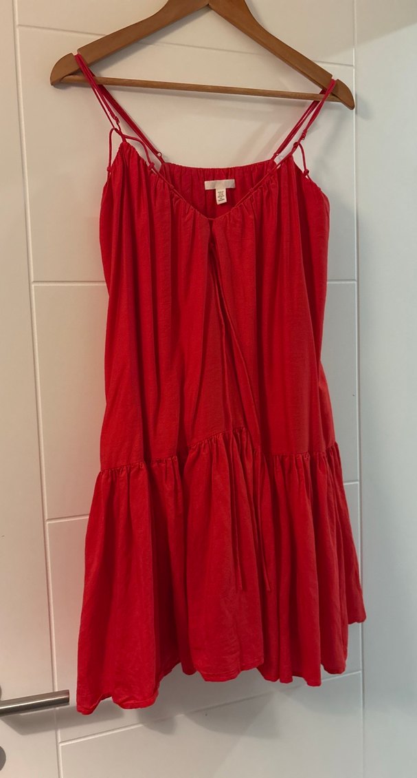 Kırmızı, askısız, midi boy, salaş kesim keten elbise. Parlak görünümlü, dökümlü tasarımıyla bohem tarzı yansıtıyor. Romantik akşamlar için uygun.