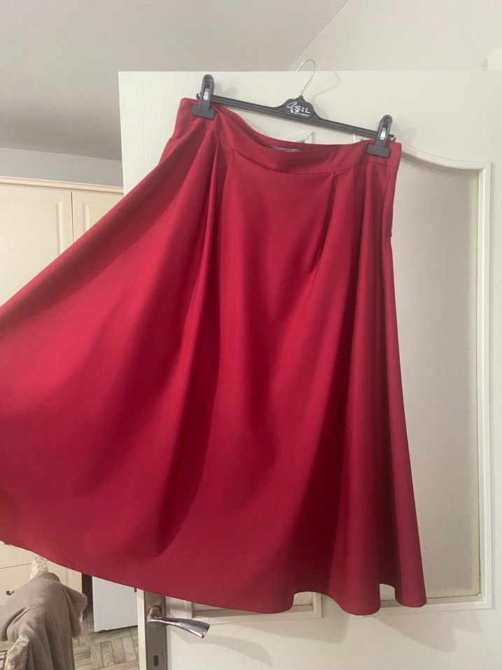 Kırmızı midi boyda, saten parlak kumaştan, salaş kesimli ve drapeli bir etek. Romantik akşamlar için uygundur. Hiçbir sıkıntı yok 1 defa giyildi