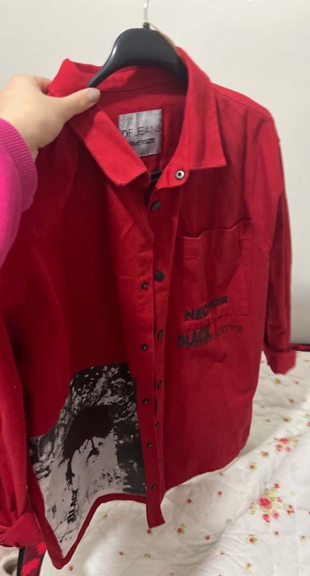 Düğmeli, baskılı detaylara sahip kırmızı, uzun kollu, bol kesim midi ceket. Notlu yaka ile sokak stili için uygun.