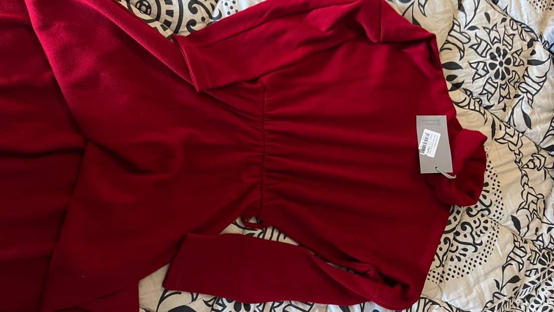 Drapeli ve parlak kırmızı renkte, V yaka ve uzun kollu, midi uzunlukta. Yumuşak sentetik kumaştan, romantik akşamlar için uygundur. Kemerini bulamadım