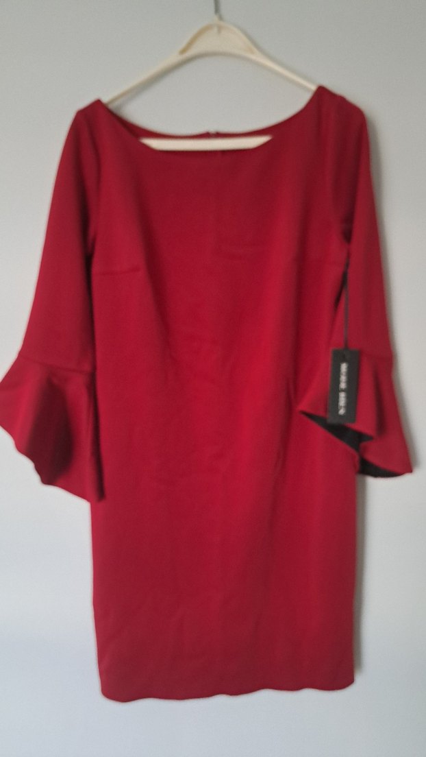 Kırmızı midi uzun kollu elbise, drapeli kol detayları ve kayık yaka ile ofis stiline,abiyeye uygun bol kesim sunar.