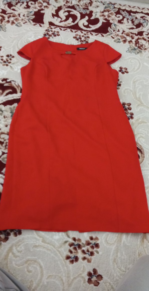 Kırmızı renkte, V yakalı, kolsuz ve drapeli midi elbise. İş ortamı için uygun, dar kesim ve sade tasarıma sahip. astarlı sadece kalem lekesi olmuş