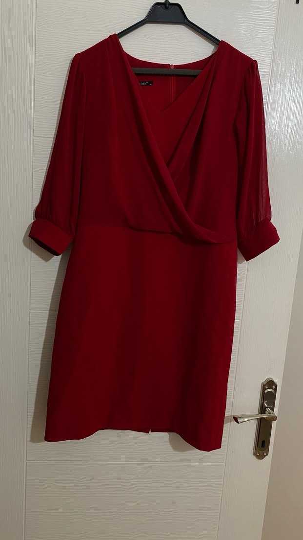 Bayrak kırmızısı midi boy, V yaka ve uzun kollu drapeli kadın elbise. Salaş kesimi ve desensiz yapısıyla #ofis #düğün #nikah #toplantı #kutlama bir çok özel gün için modern klasik stil sunar. Kolları bileklere kadar gelmiyor daha yukarıda ve dökümlü duruyor şifondur. Önündeki kruvaze elbiseye şıklık katıyor. Ölçüleri de görselledim bedeninizse dolabınızda elinizin altına her an kurtarıcı olur.