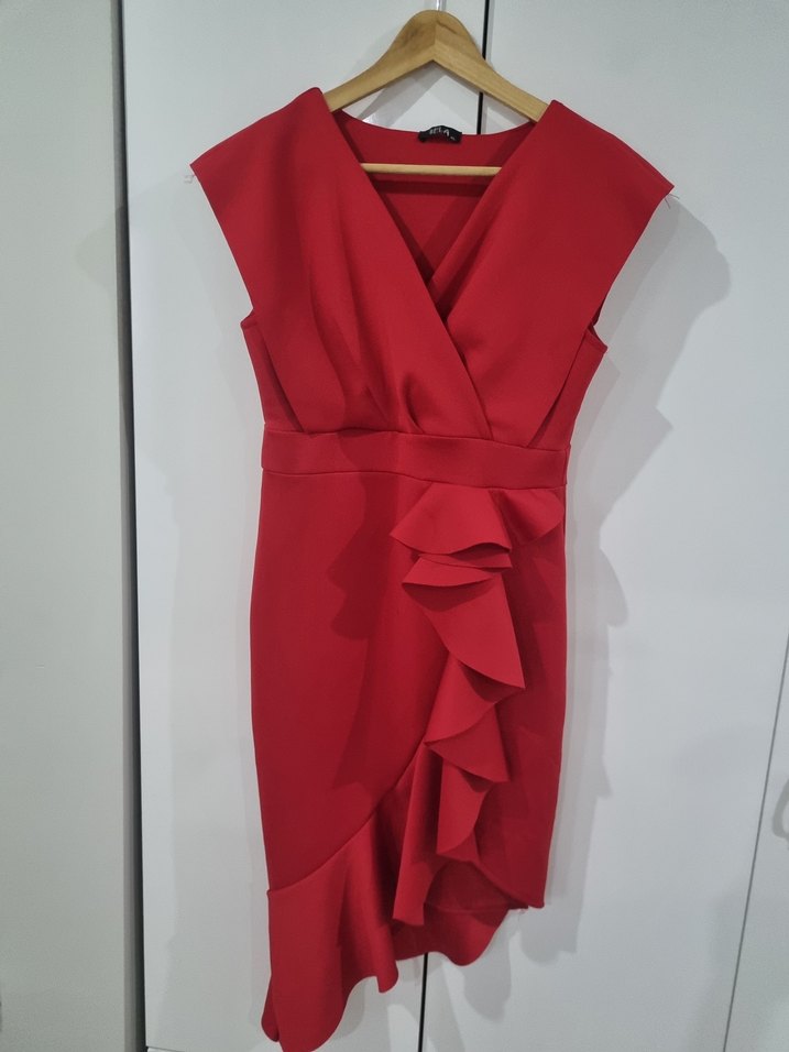 Kırmızı midi elbise, V yaka ve kolsuz, cesur fırfır detayıyla modern ofis stiline uygun. temiz ürün hiçbir sorunu yoktur esnek bi kumaşi var liralık herkese çok rahat olur markasi zara değil bilginize