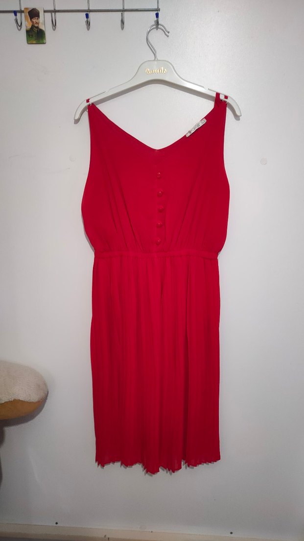 Kırmızı midi uzunlukta, V yakalı, düğmeli ve kolsuz elbise. Kol askıları kendime göre ayarlamıştım söküp ayarlanabilir tekrardan.