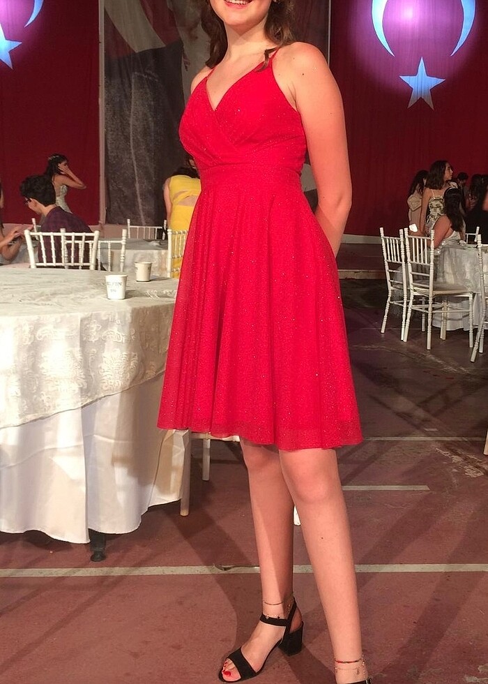 Mezuniyet için aldığımız ve bir kez giyilen kırmızı simli gece elbisesi. Üstte çok şık ve kaliteli duruyor. Mini bir elbise ama dizin biraz üstünde, çok kısa değil. Fotoğrafta anlaşılmıyor ama kumaşı simli, pırıltılı hafif abiye bir kumaş.
