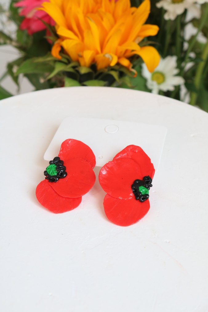 Kırmızı mini küpeler, renkli çiçek formunda ve boncuk detaylıdır. Minimalist pop kültür tarzında, parti için uygundur.