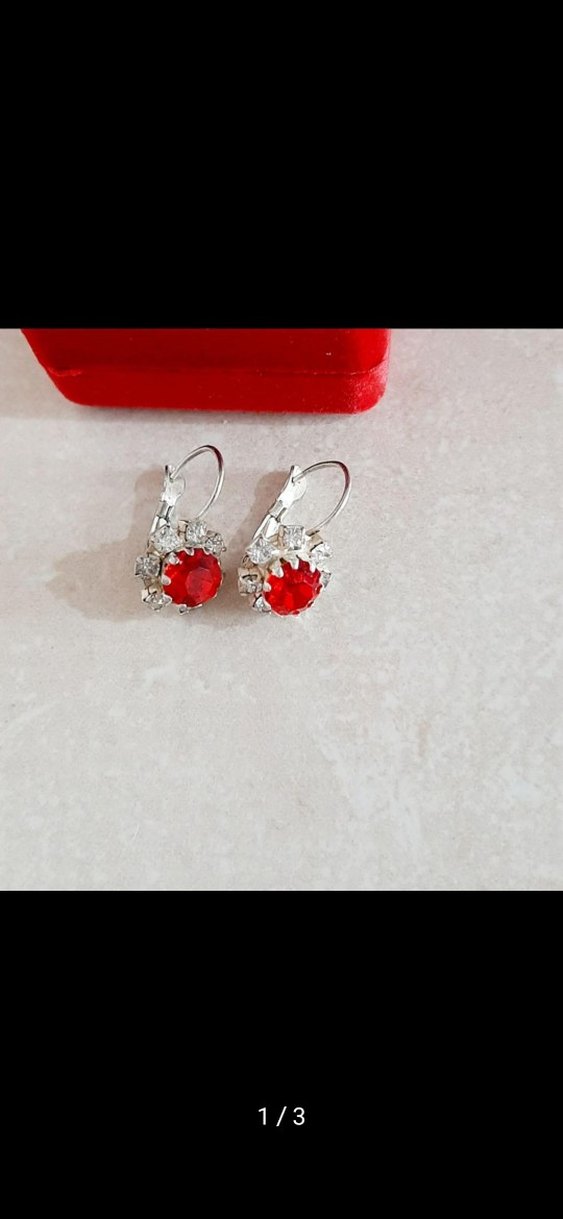 Kırmızı mini küpeler, çiçek desenli ve taşlıdır. Düğün ve klasik zarafet için uygundur. Modern vintage dokunuşlu, renkli ve kısa uzunlukta.