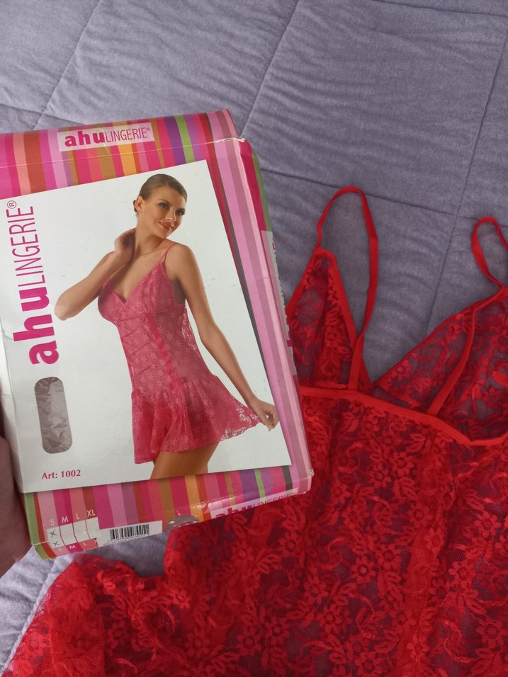 Kırmızı ince askılı, baskılı dantel desenli, vücuda oturan mini gecelik ve tanga set. avangart tarzda.
