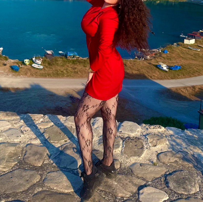 Dantel detaylı, uzun kollu ve yüksek yakalı kırmızı mini elbise. Sentetik kumaştan, koyu renk yılan deseniyle gotik tarzda.