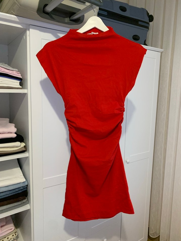 Yumuşak keten kumaştan yapılmış, yüksek yakalı mini elbise