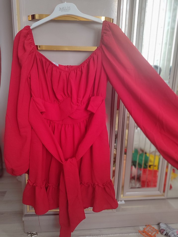 ş, m beden uyumlu Parlak kırmızı mini elbise, volan detaylı ve straplez yakalıdır. Salaş kesimi ve bohem tarzı ile romantik akşamlar için uygundur. sıfır etiketli
