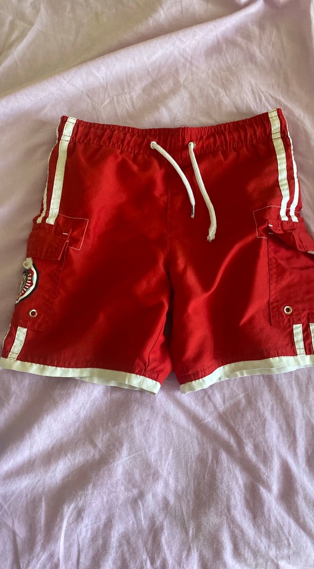 Parlak kırmızı, beyaz yan şeritli, kemerli ve dar kesim erkek mayo şortudur. Plaj ve sokak stiline uygundur.