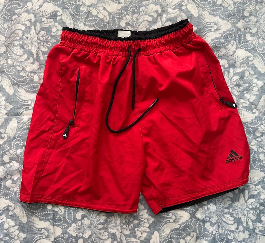 Dış mekan kullanımı için elastik bel bantlı, fermuarlı cepli, bol kesim kırmızı erkek yüzme şortu. Hiç kullanılmamıştır