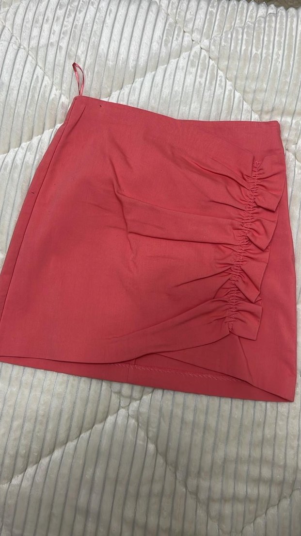 Parlak kırmızı mini etek, dar kesim ve yan tarafında fırfır detaylıdır. Sentetik kumaştan yapılmış, çağdaş ve minimalist bir görünüm sunar.