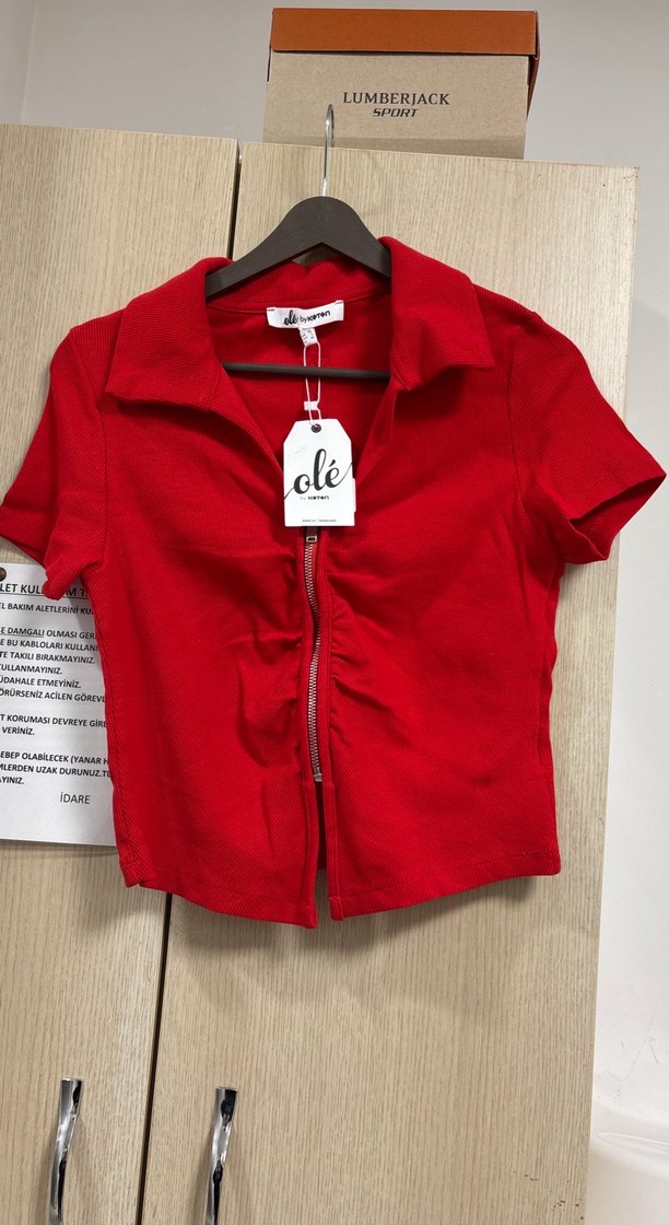 Kısa kollu, V yaka ve ön fermuarlı kırmızı mini bluz. Parlak görünümlü sentetik kumaştan yapılmıştır, trend sokak stili için uygundur.