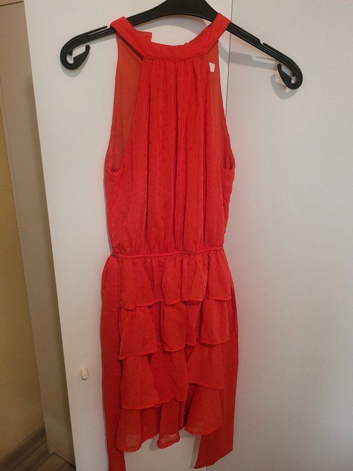 Kırmızı, mini boy, yüksek yakalı ve kolsuz bu bohem abiye elbise, kat kat fırfır detayıyla şık bir görünüm sunar. Parlak kumaşı parti için uygundur.