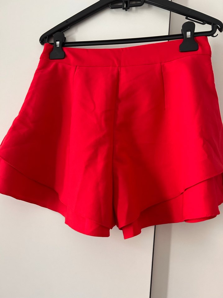 Kırmızı mini şort, vücuda oturan kesim ve fırfır detaylarla, yumuşak sentetik kumaştan. Cesur sokak stili için romantik geceye uygun. ❤️