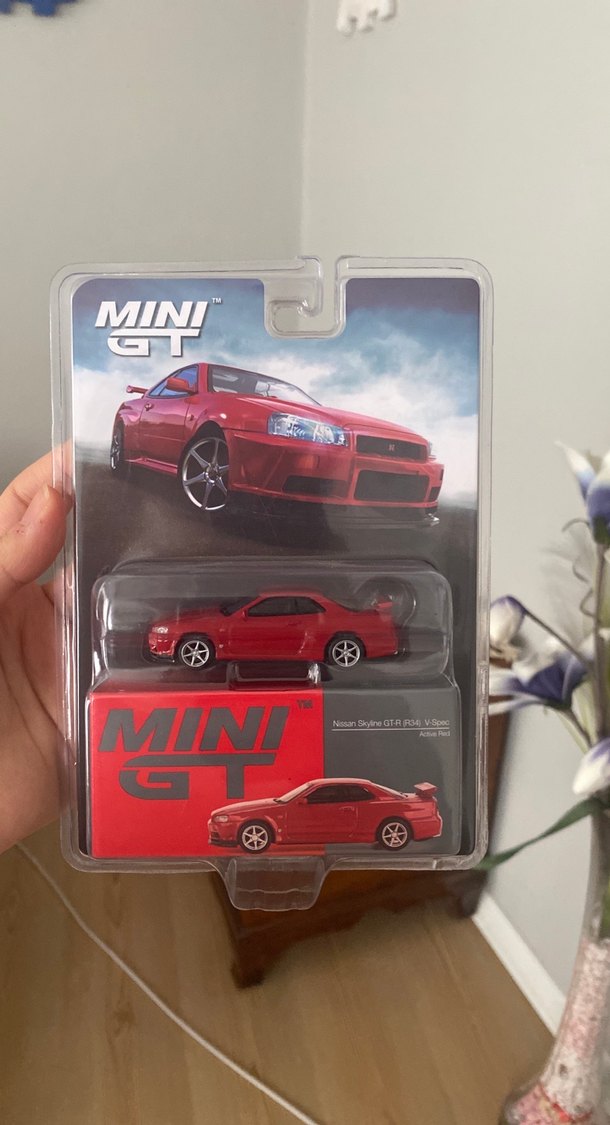 Koyu kırmızı renkte, Nissan Skyline GT-R R34 model detaylı MINI GT oyuncak araba. Gerçekçi tasarım öğeleri içerir. 1.64 ölçek