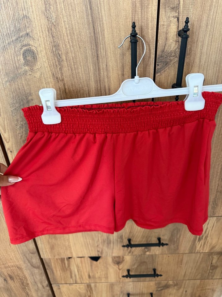 Kırmızı mini hamile şortu, bol kesim ve esnek bel bandı ile rahatlık sağlar. Sentetik kumaştan, renkli ve zahmetsiz şıklık sunar, dış mekan sokak tarzına uygundur.