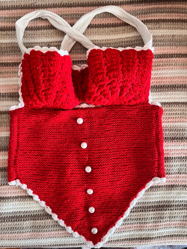 Kısa boy ve fitted kesime sahip kırmızı hemşire korsesi, beyaz düğme ve bant detaylı, yumuşak dokulu örme kumaş.
