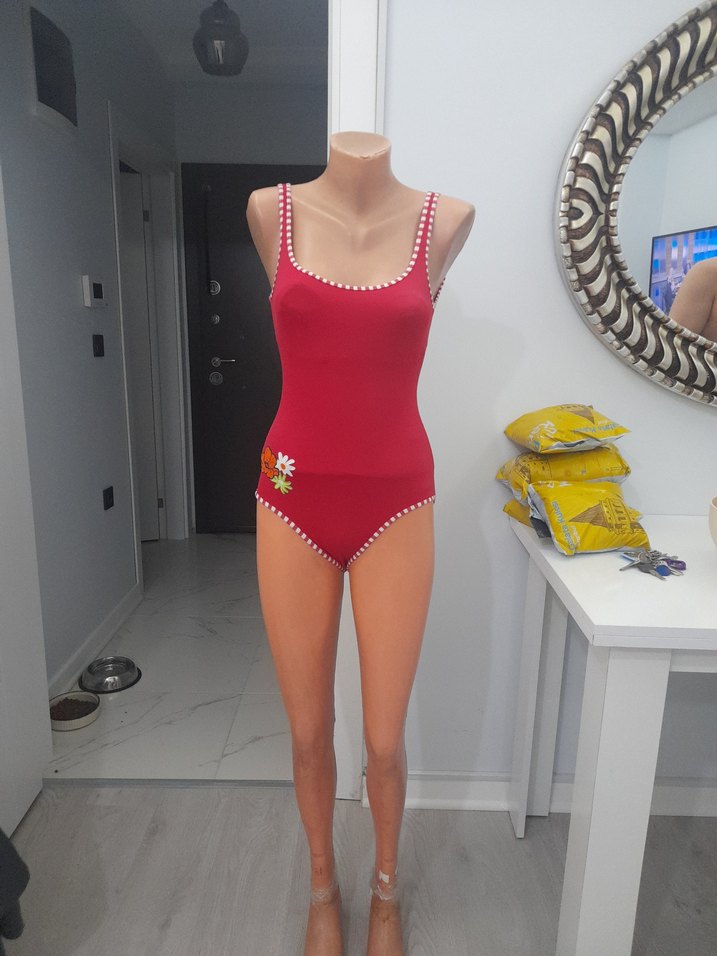 Kırmızı, ince askılı ve mini boyda, vücuda oturan kadın mayosu. Desensiz, küçük çiçek detayıyla sahil için renkli ve cesur bir tarz sunar.