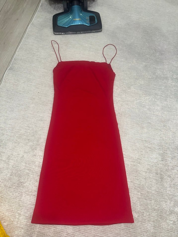 İnce askılı, dar kesim kırmızı mini elbise, . Düz ve desensiz, günlük kullanıma uygundur. ❤️ m beden yazıyor ama s bedene daha iyi olur