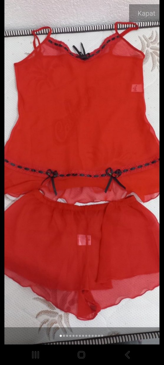 Kırmızı mini pijama takımı, ip askılı ve küçük fiyonk detaylarına sahip. Minimalist gotik tarzda, kısa ve rahat kumaştan üretilmiştir.