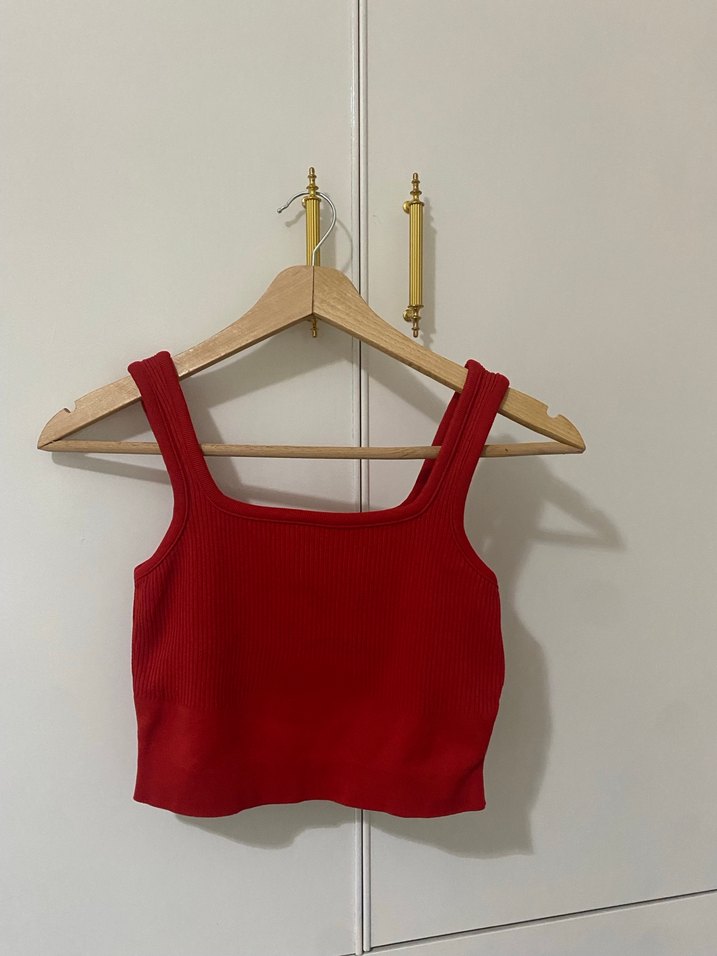 Düz kırmızı, kısa kesim, kadın atlet. Kare yakalı, kolu olmayan, vücuda oturan tasarımıyla günlük sokak stiline uygun şık bir parça.