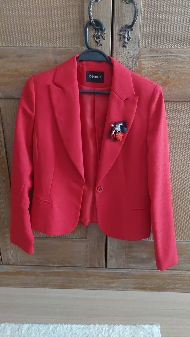 çok güzel. Kırmızı mini blazer, kesik yakalı, düğmeli ve uzun kolludur. Ofis ve günlük kombinlere uygundur.